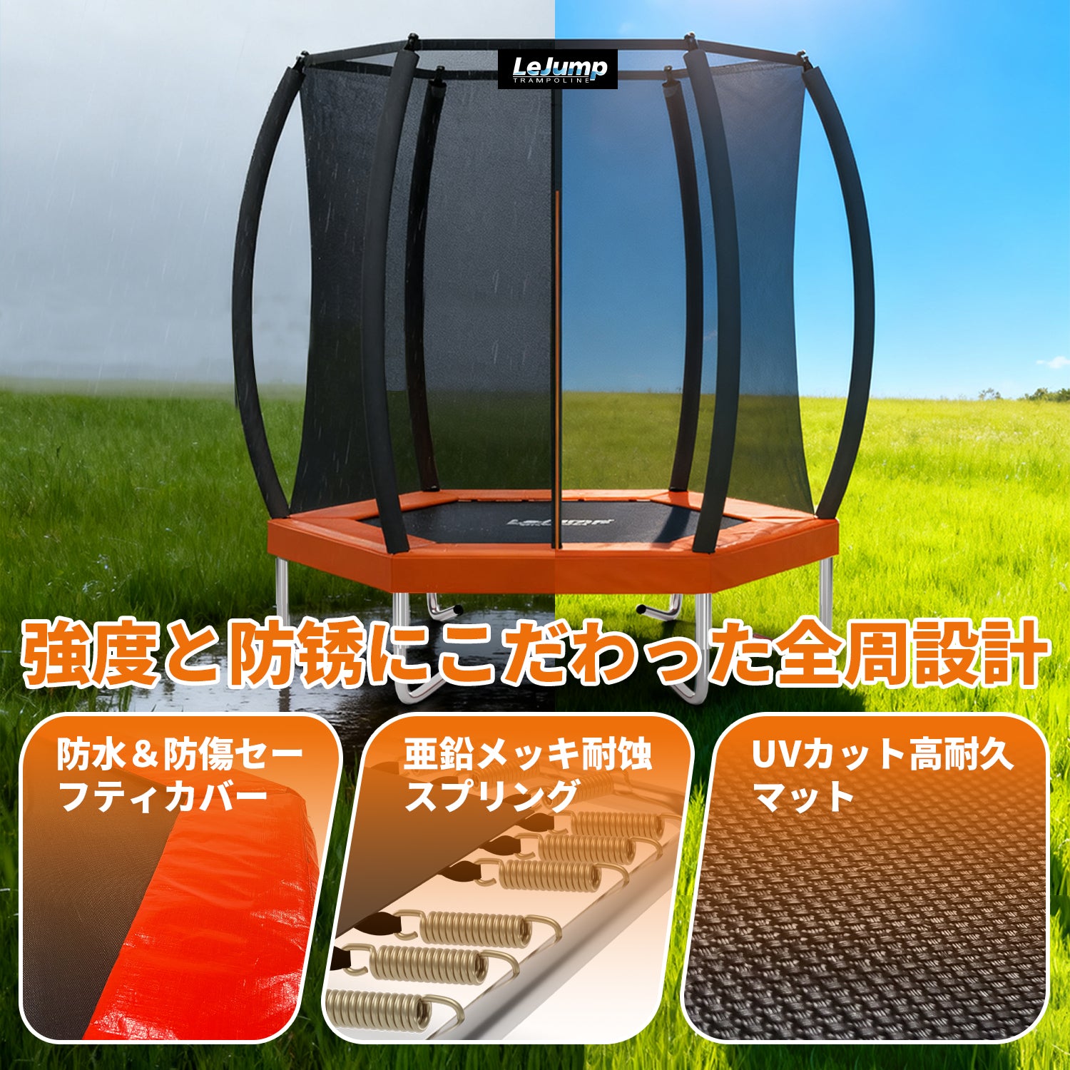 LeJump Lightningシリーズには、事故を防ぎ、建物の品質を促進するモダンなガラス繊維製の安全ポール構造が特徴です。曲線のポールは、ジャンプマットでの活動とトランポリンの頑丈なフレームとの間に追加の距離を提供します。